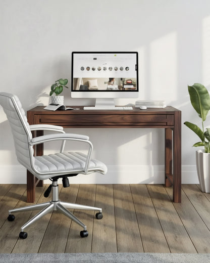 Keskin hatlara sahip olan Dusha Çalışma Masası, dikdörtgen formda kalın ayakları ile estetik bir görünüm sunarken aynı zamanda dengeyi ve stabiliteyi koruyor. Geniş tek çekmecesi ile ferah bir depolama alanına sahip olan Dusha Çalışma Masası, benzer karakterdeki kulp detayı ile tasarımın bütünlüğünü yakalıyor.