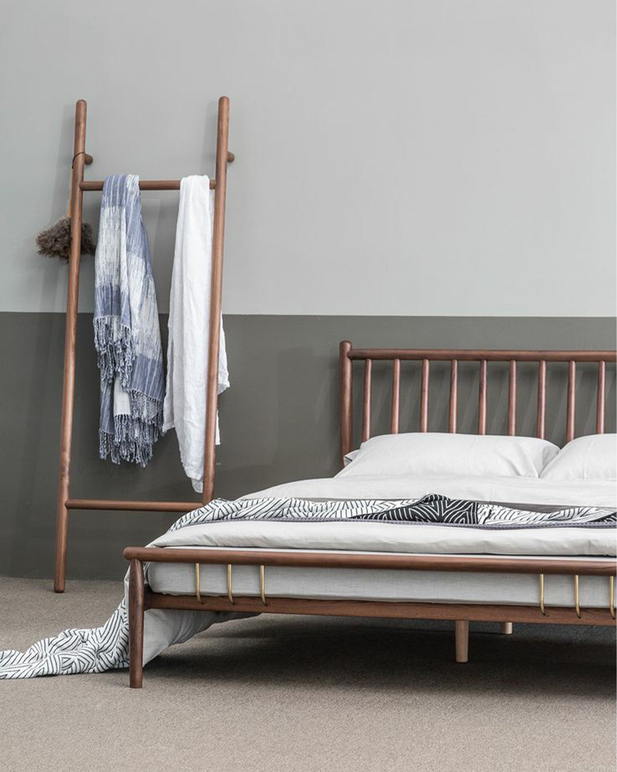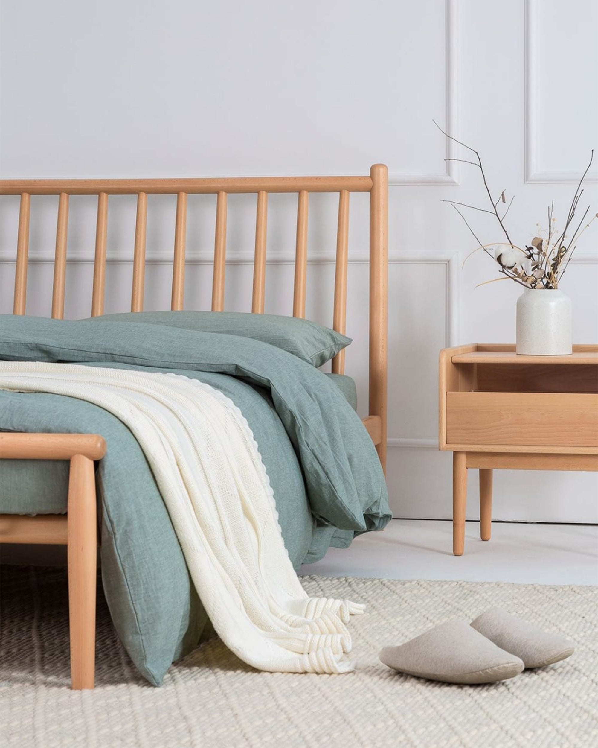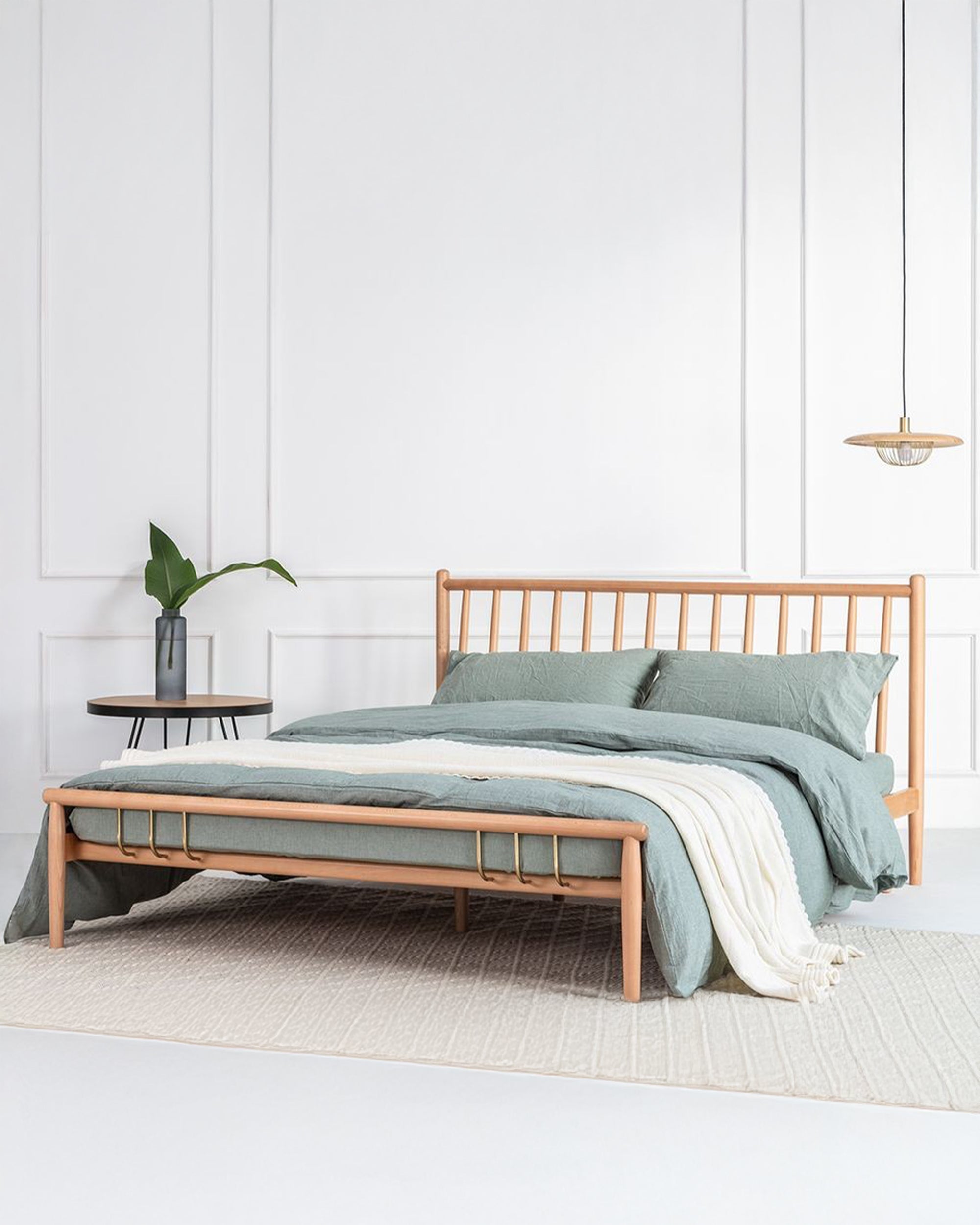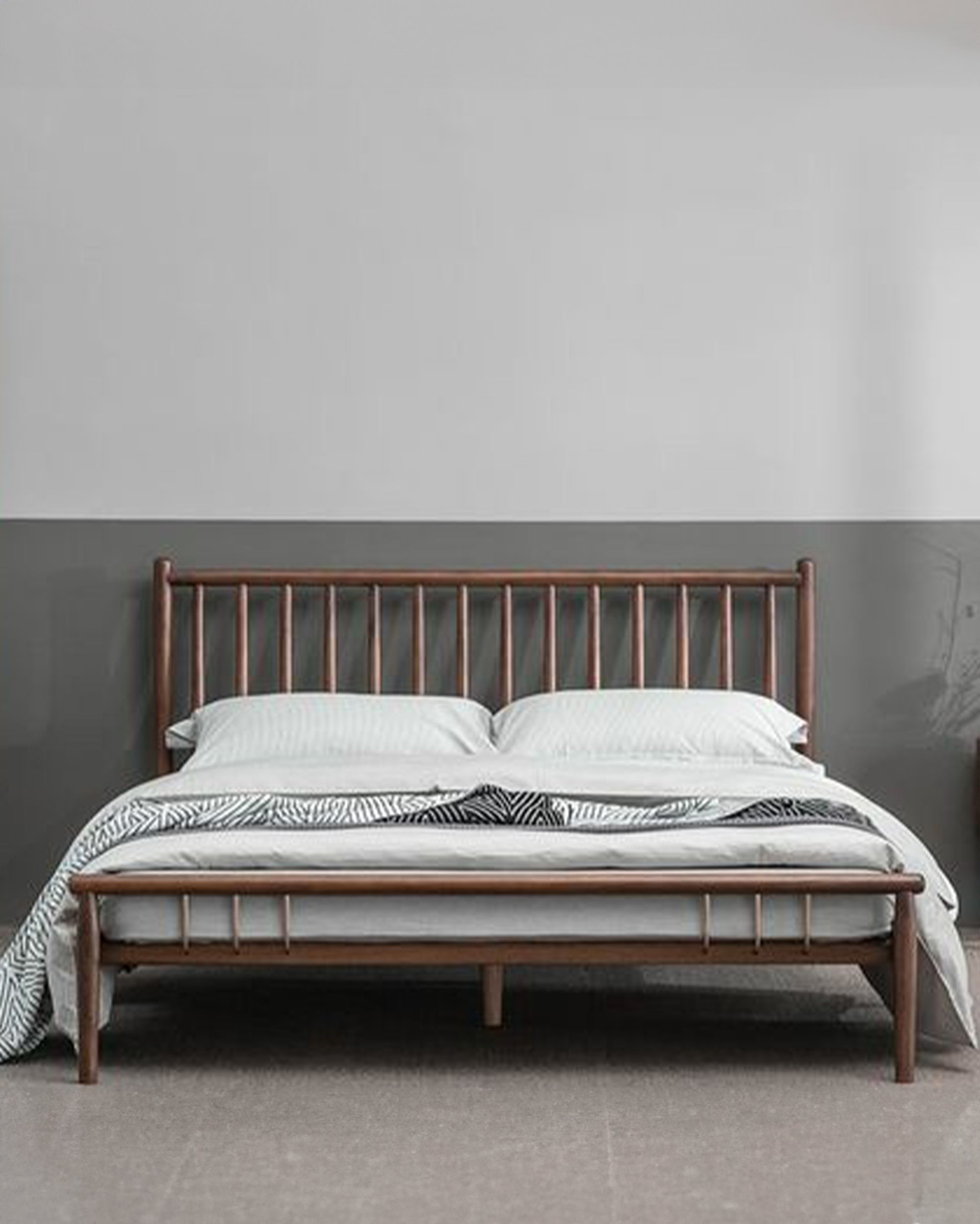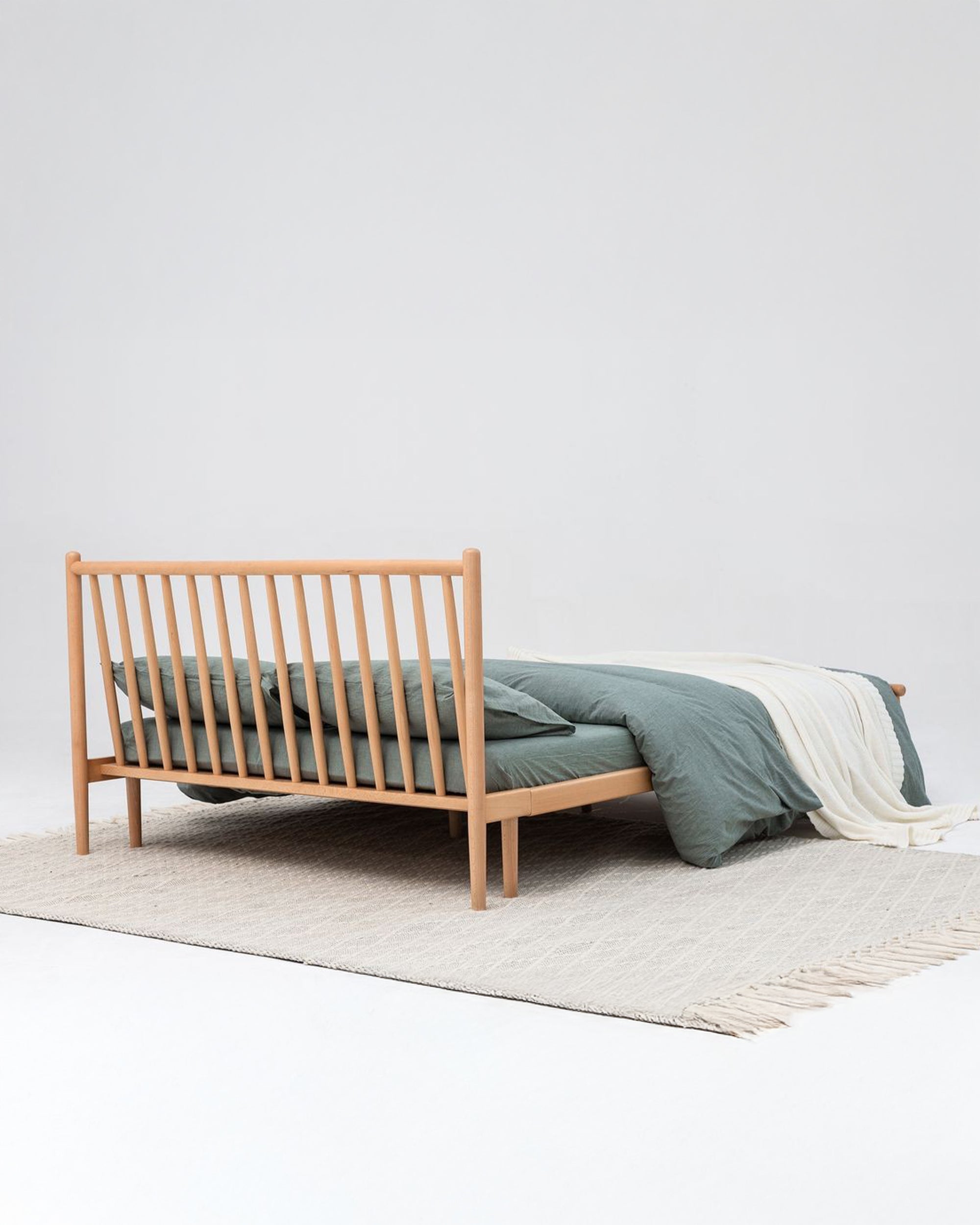 Eğimli yuvarlak çıtalı başlık yapısı, Mübrem Karyola’nın karakteristik bir özelliğidir. Bu yapının yuvarlak hatları, yatak odasına hoş bir akış ve hareketlilik katarak mekanın enerjisini yükseltir. Başlık yapısının eğimi, tasarıma dinamik bir görünüm kazandırırken aynı zamanda kullanıcıya rahat bir destek sunar.