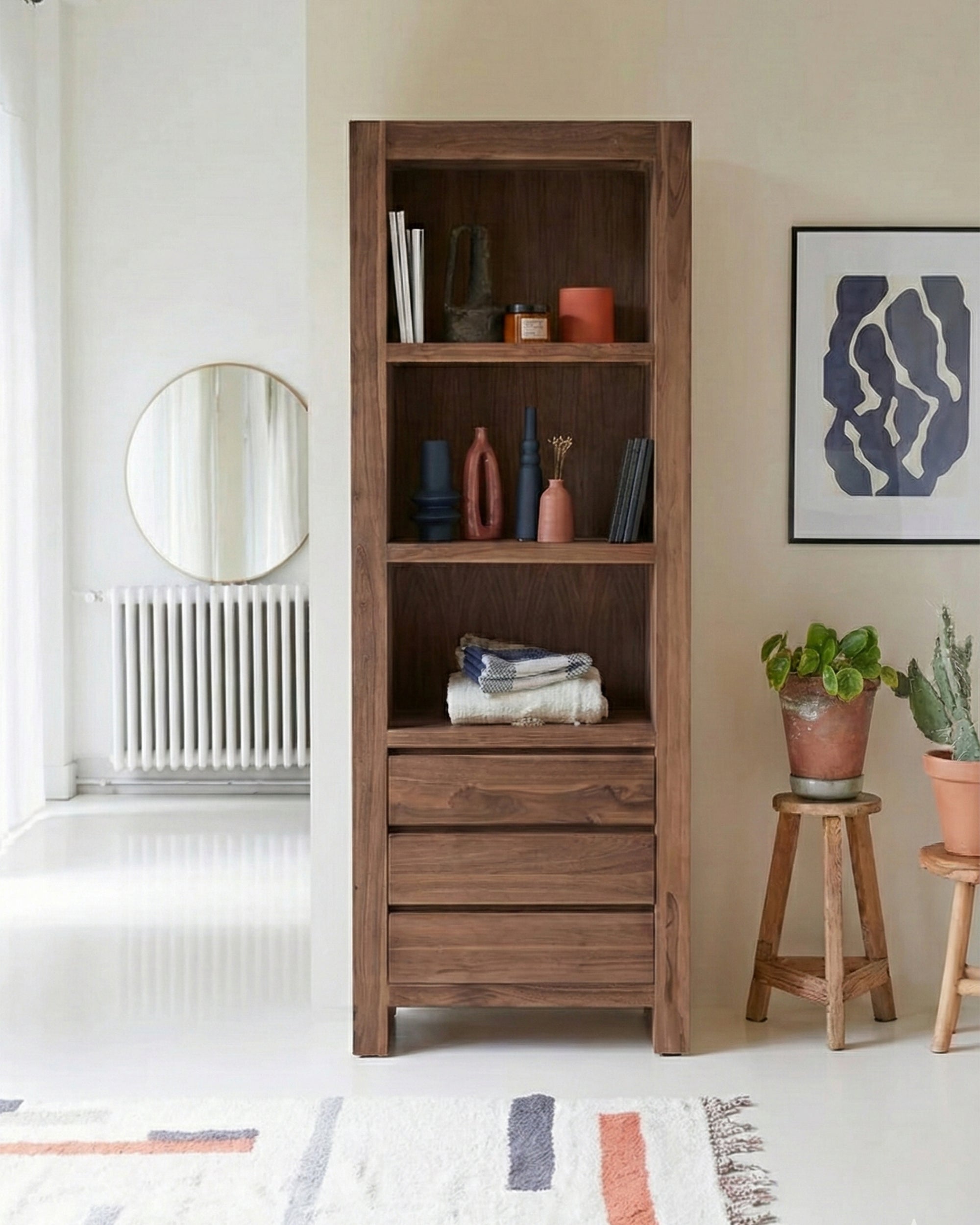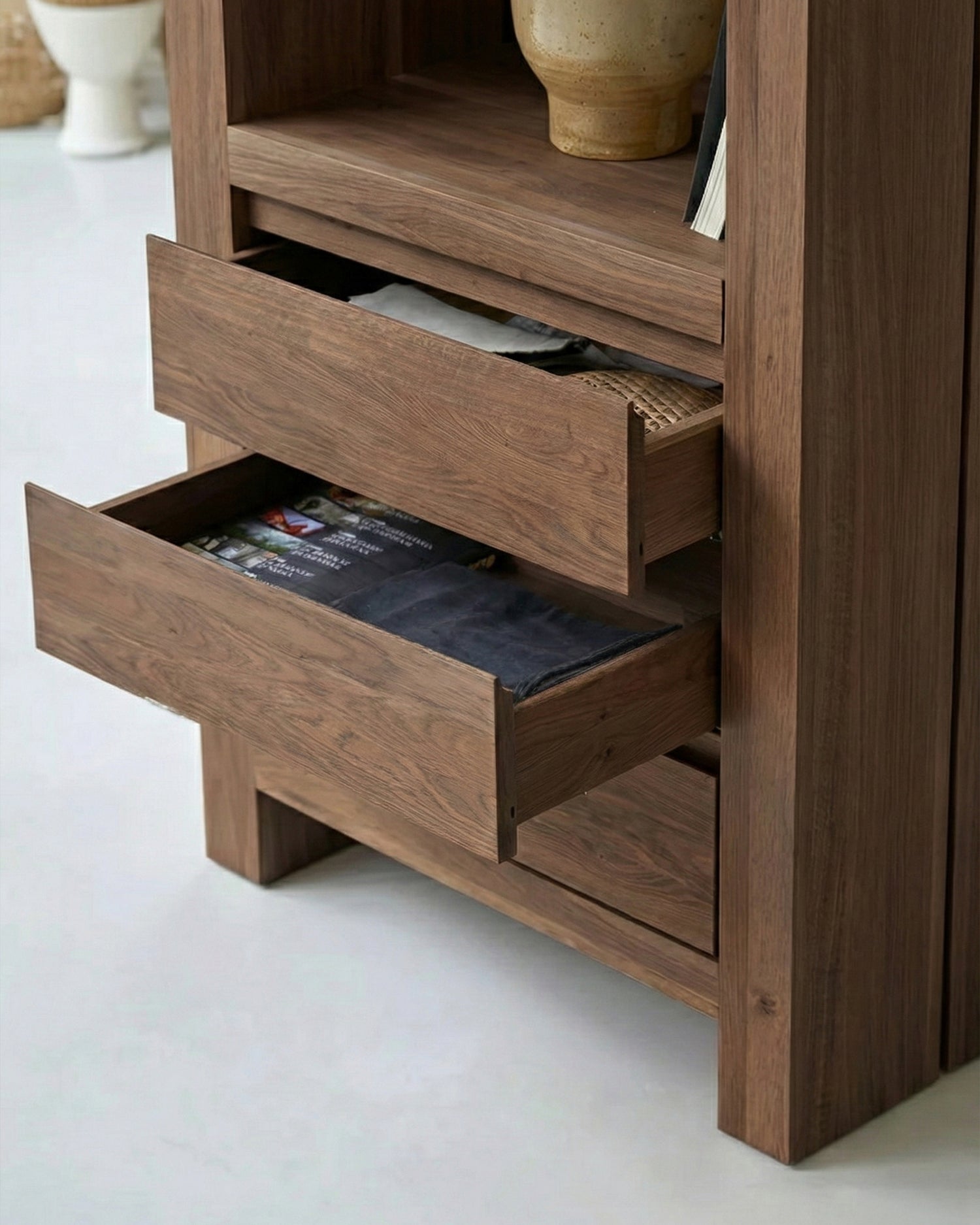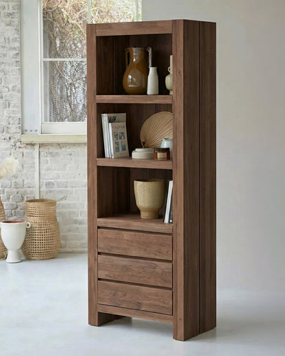 Vaye Kitaplık, büyüleyici ve etkileyici bir görünüme sahip olan kalın ve keskin hatlarıyla öne çıkan bir mobilyadır. Bu kitaplık, odanın tasarımını belirgin bir şekilde vurgulayarak heybetli bir görüntü oluşturur. Geniş ve sağlam yapısıyla göz alıcı bir duruş sergileyen Vaye Kitaplık, hem kullanışlı hem de estetik bir çözüm sunar.
