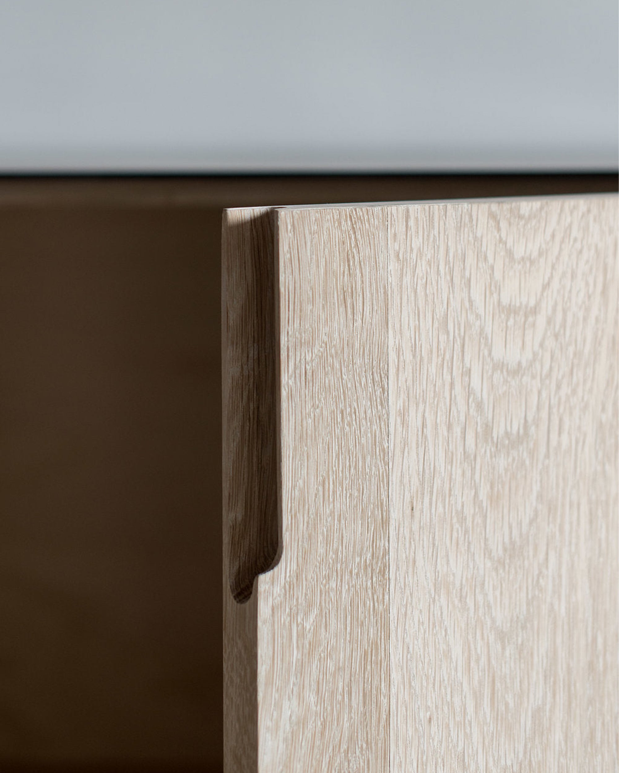 Ahşap kapaklar, depolama alanını gizleyerek düzenli bir görüntü oluştururken aynı zamanda rahat erişim sunar. Kenar pahlı çerçeve ise tasarımın bütünlüğünü korurken, kullanılan malzemeler arasında hoş bir denge sağlar.