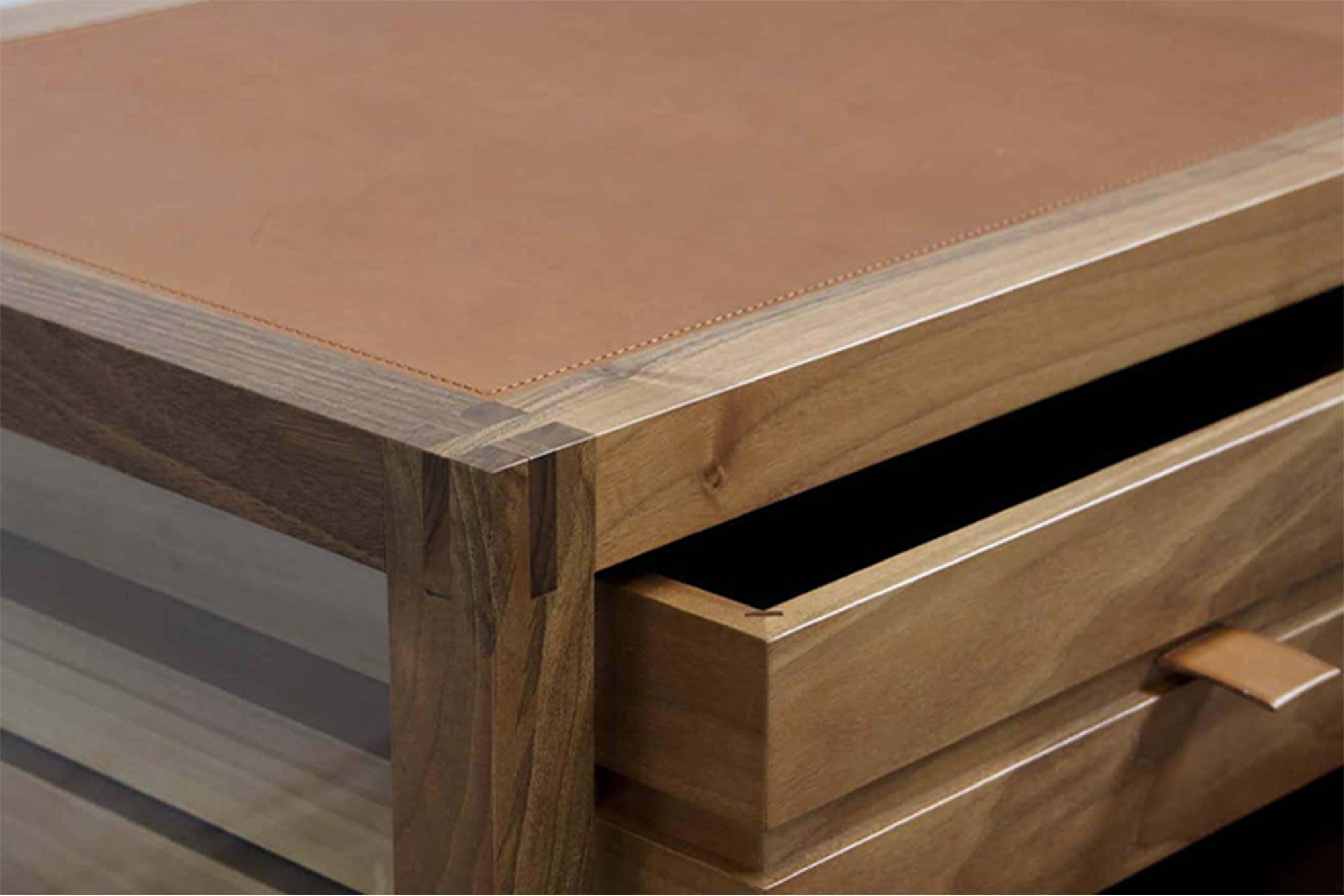 Deri detayların pürüzsüz ve zengin dokusu, mobilyanın yüzeyine değerli bir his ve estetik kazandırırken aynı zamanda dokunsal bir zenginlik sunuyor.