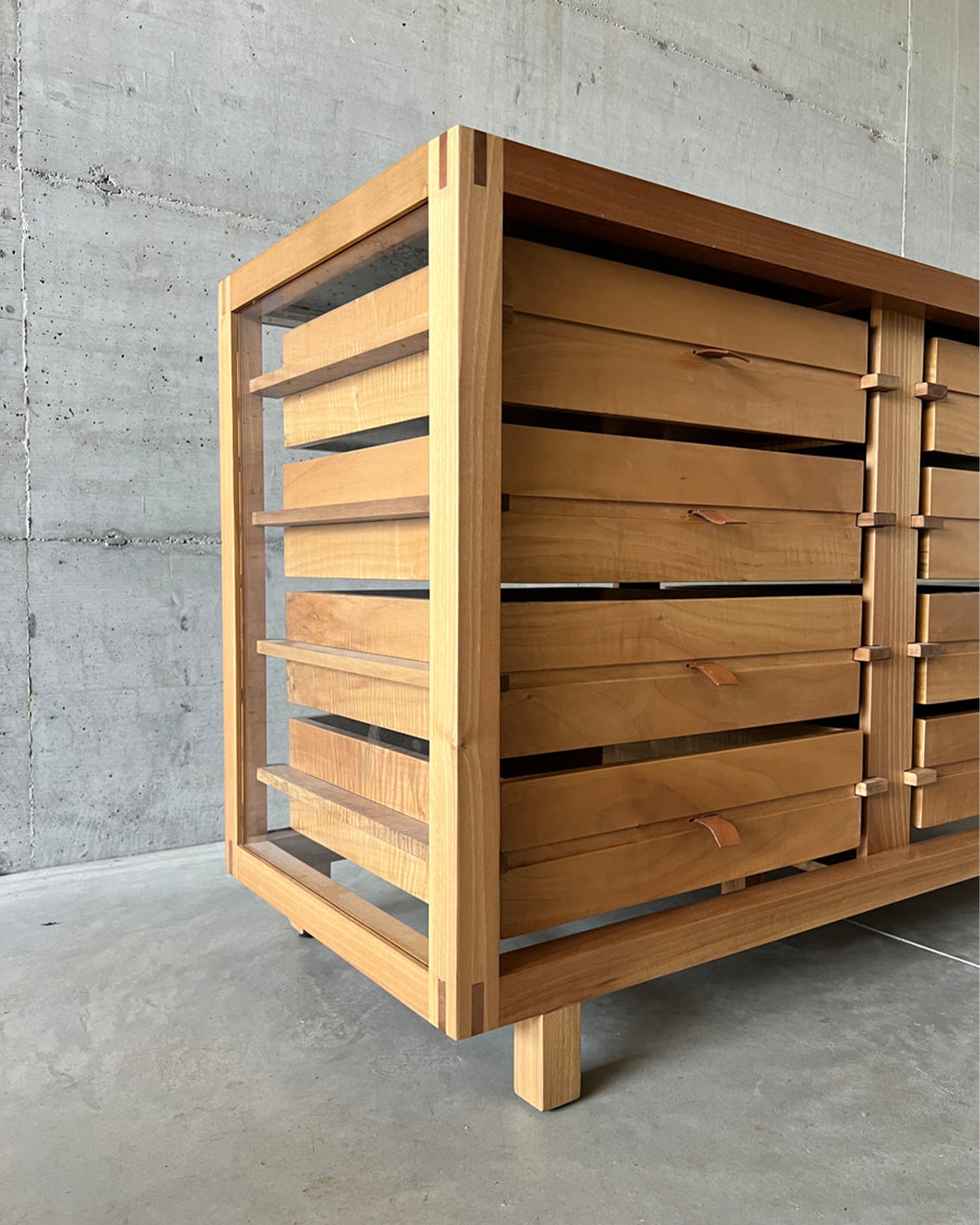 Geleneksel ahşap çıtalı rayların, deri üst tablanın ve deri kulp detaylarının eşsiz bir uyumuyla ortaya çıkan Sem´ya Şifonyer, benzersiz bir tasarım bütünlüğü sunar. Hem modern hem de retro öğeleri bir araya getirerek zamana meydan okuyan bu şifonyer, iç mekânınıza özgün bir karakter katıyor.