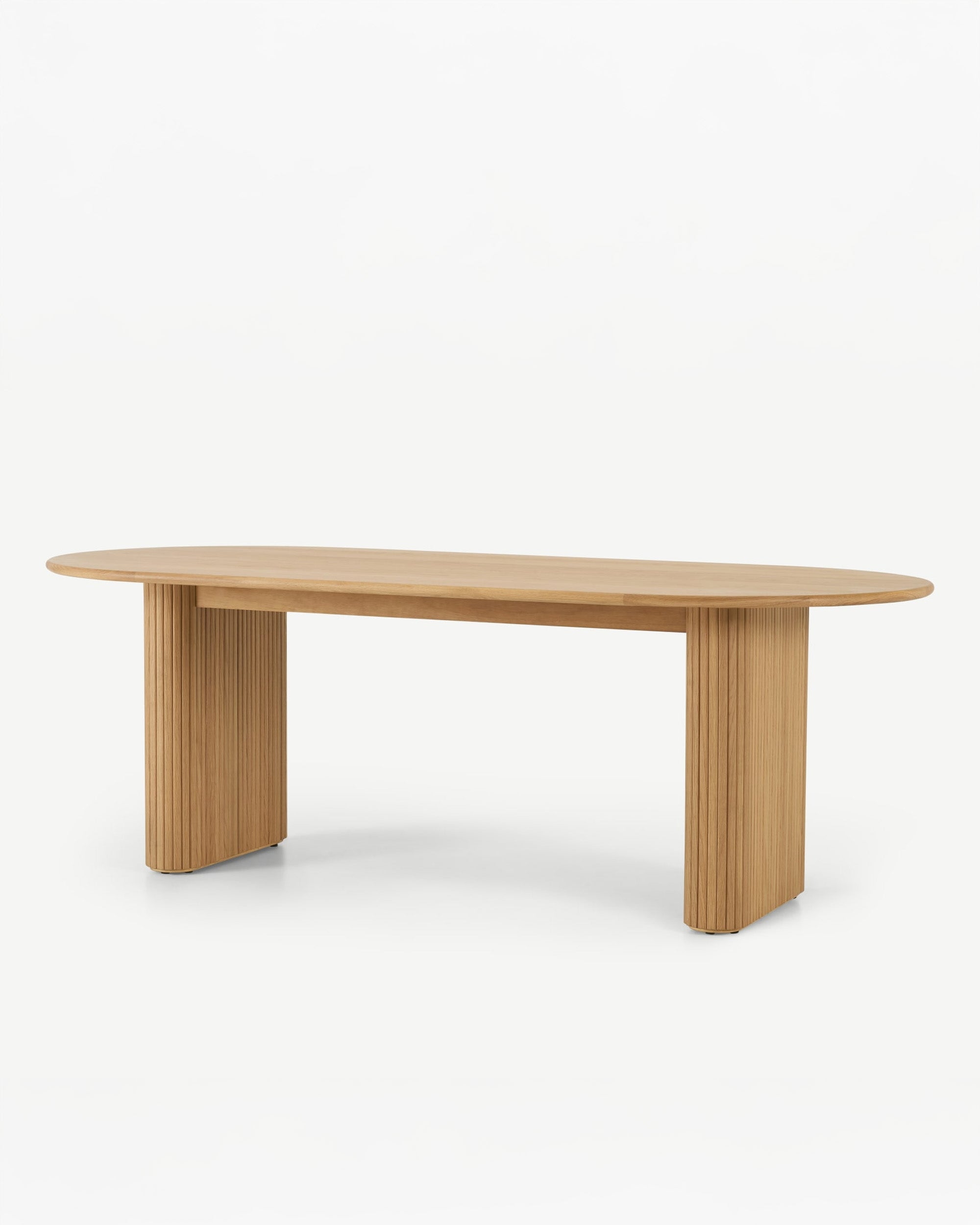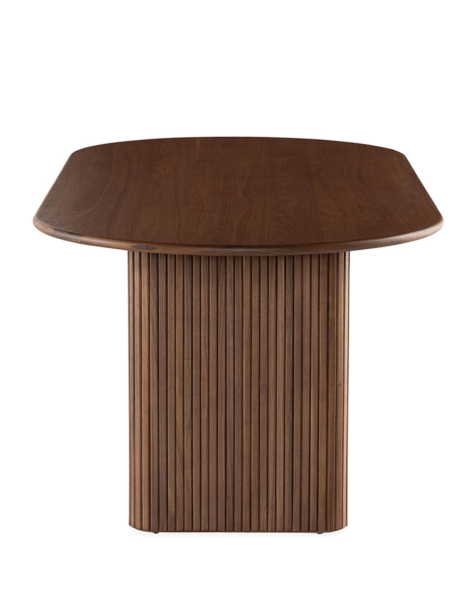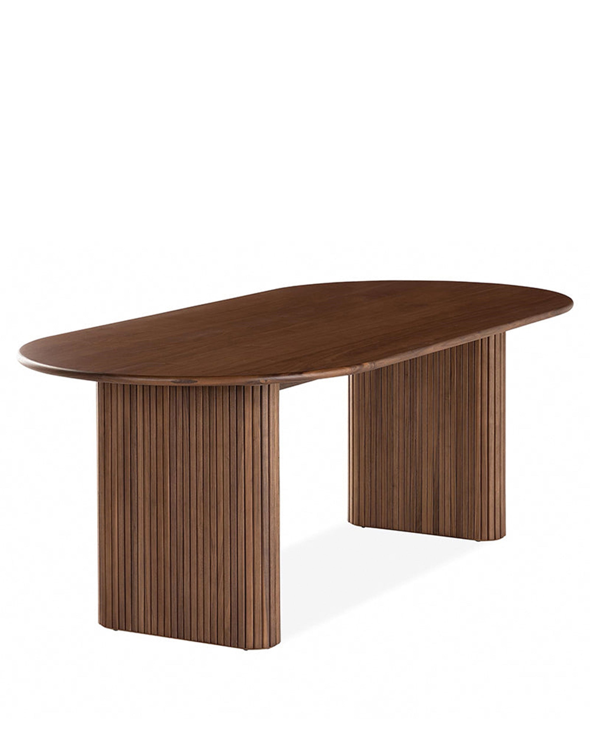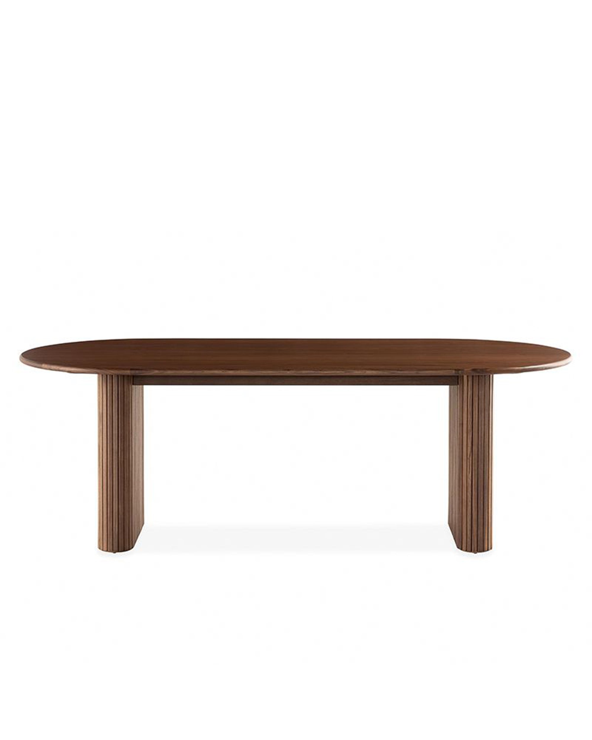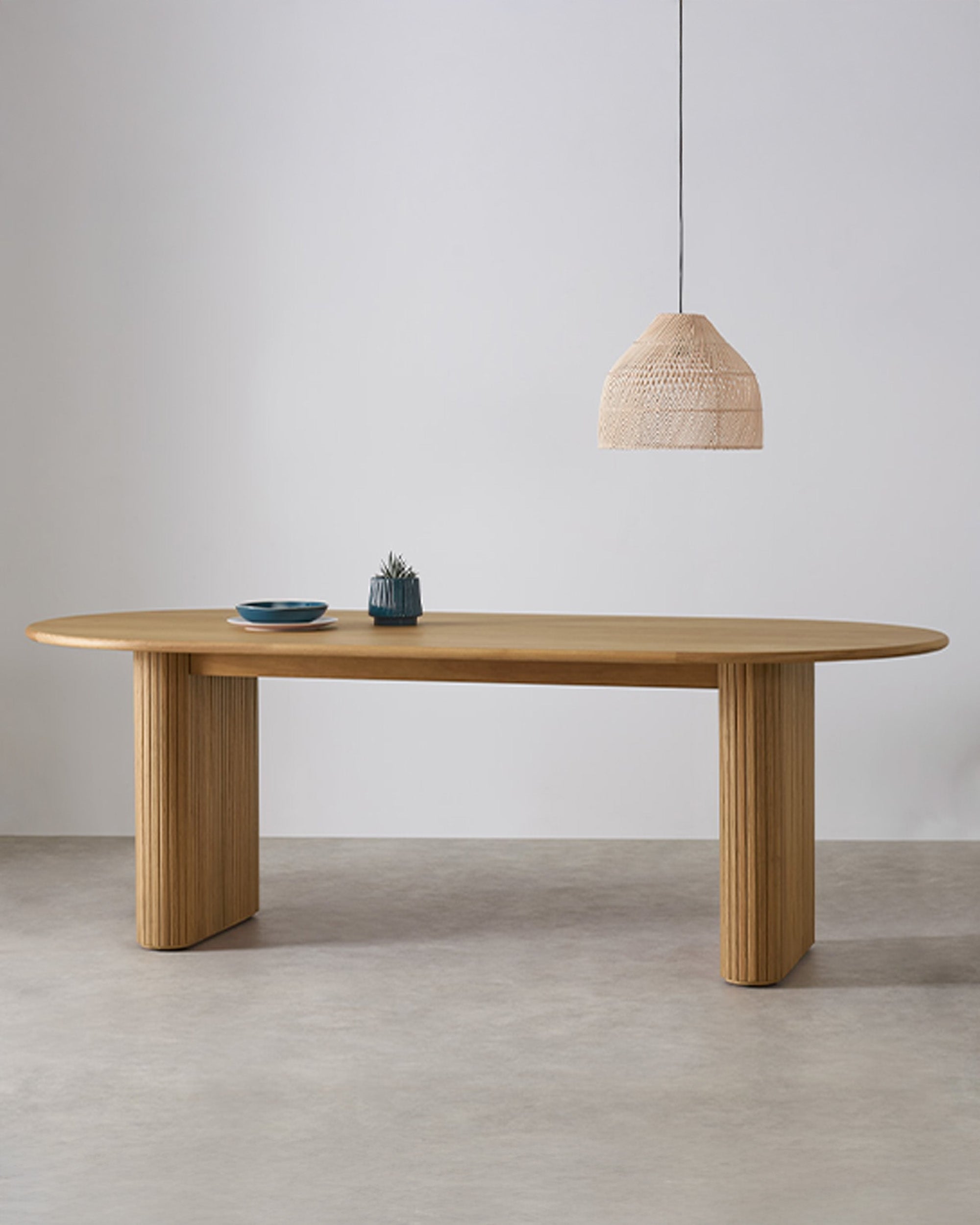 Pervane Yemek Masası, hassas el işçiliği ile birleştirilmiş çıtalardan oluşan ayakları ile zarif bir görüntüyü ustalıkla sunarken, kenar oval elips kesim tablasıyla mükemmel bir uyum yakalayarak zamansız bir tasarımı ortaya koyuyor.