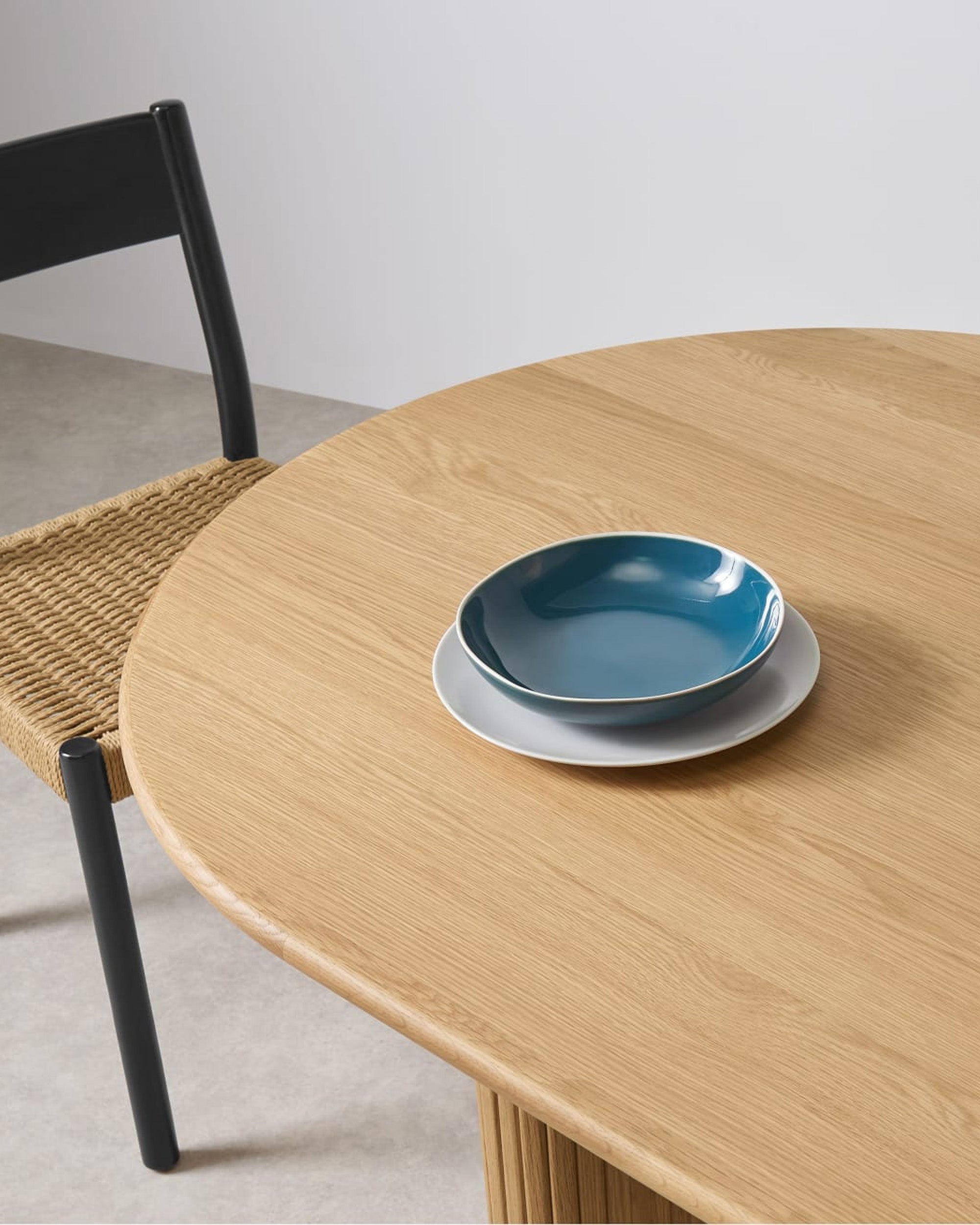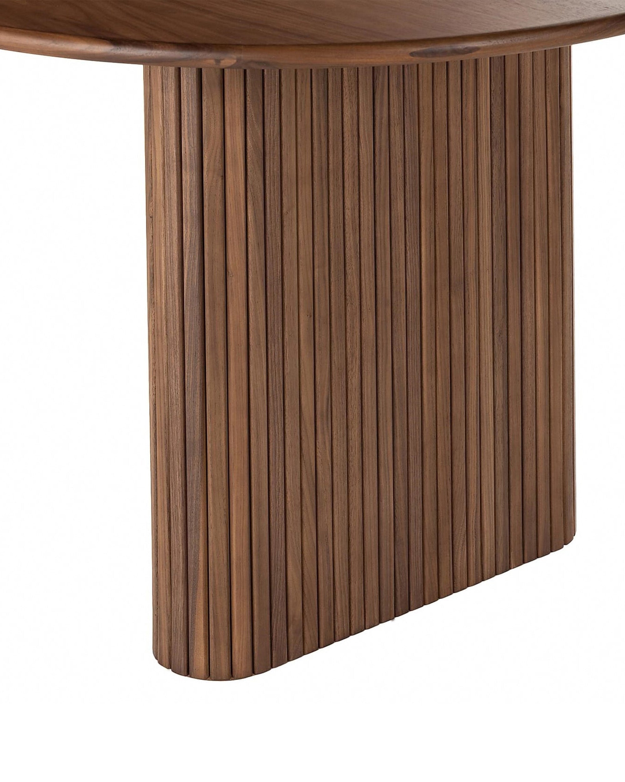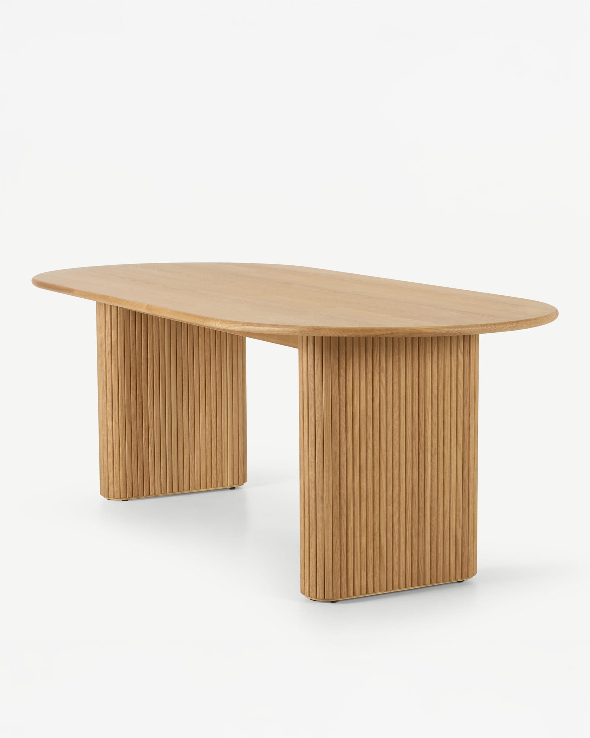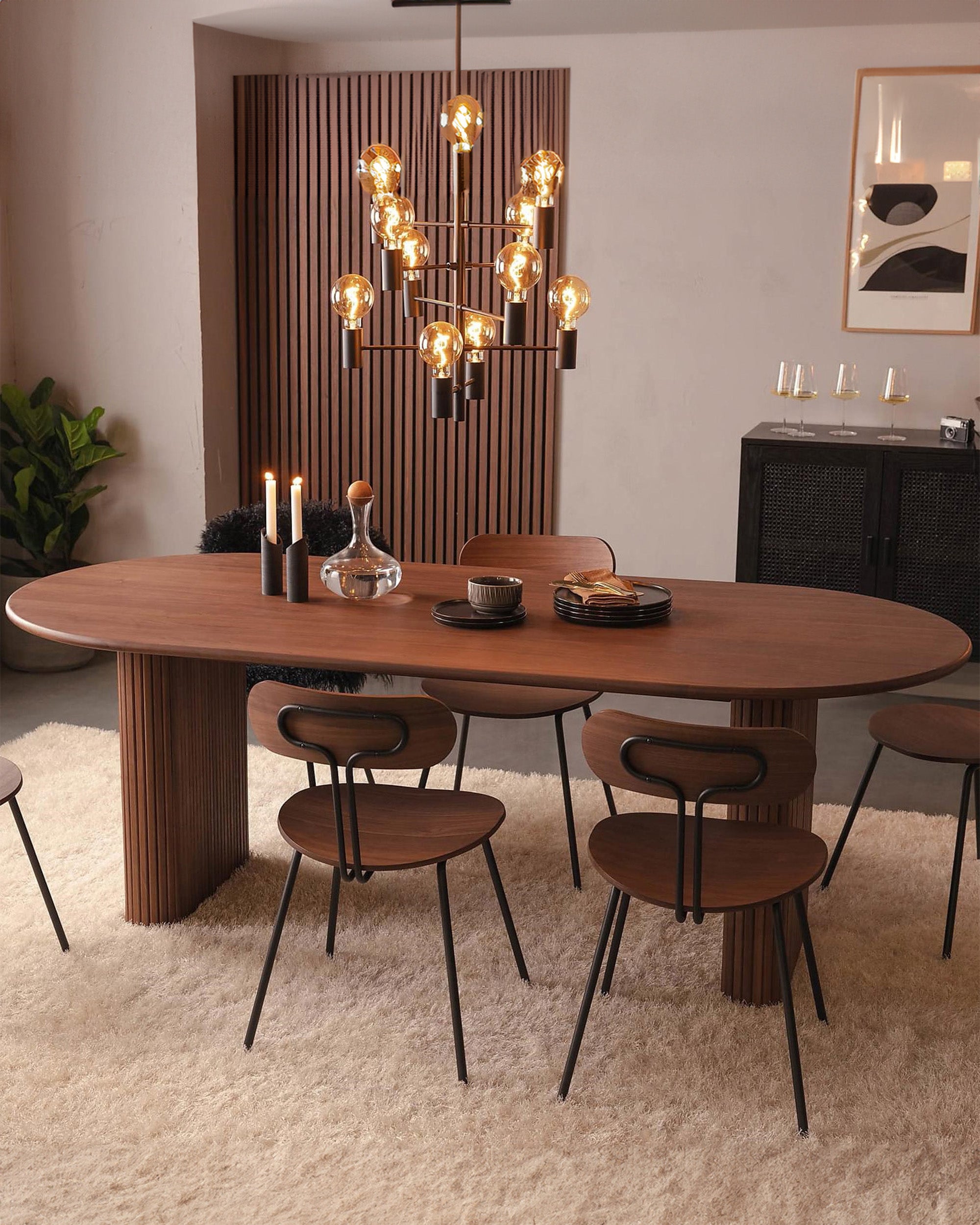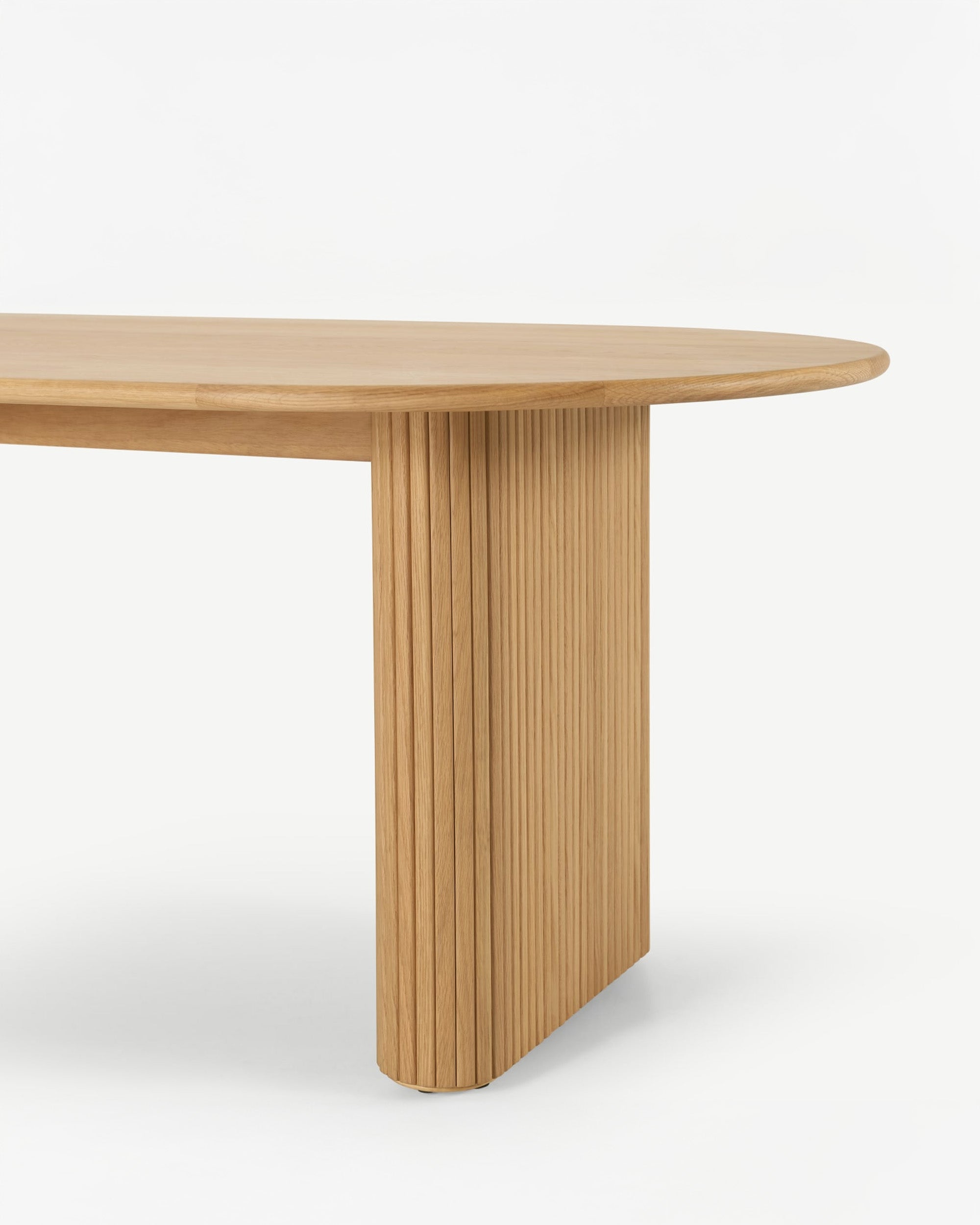 Pervane Yemek Masası, hassas el işçiliği ile birleştirilmiş çıtalardan oluşan ayakları ile zarif bir görüntüyü ustalıkla sunarken, kenar oval elips kesim tablasıyla mükemmel bir uyum yakalayarak zamansız bir tasarımı ortaya koyuyor.