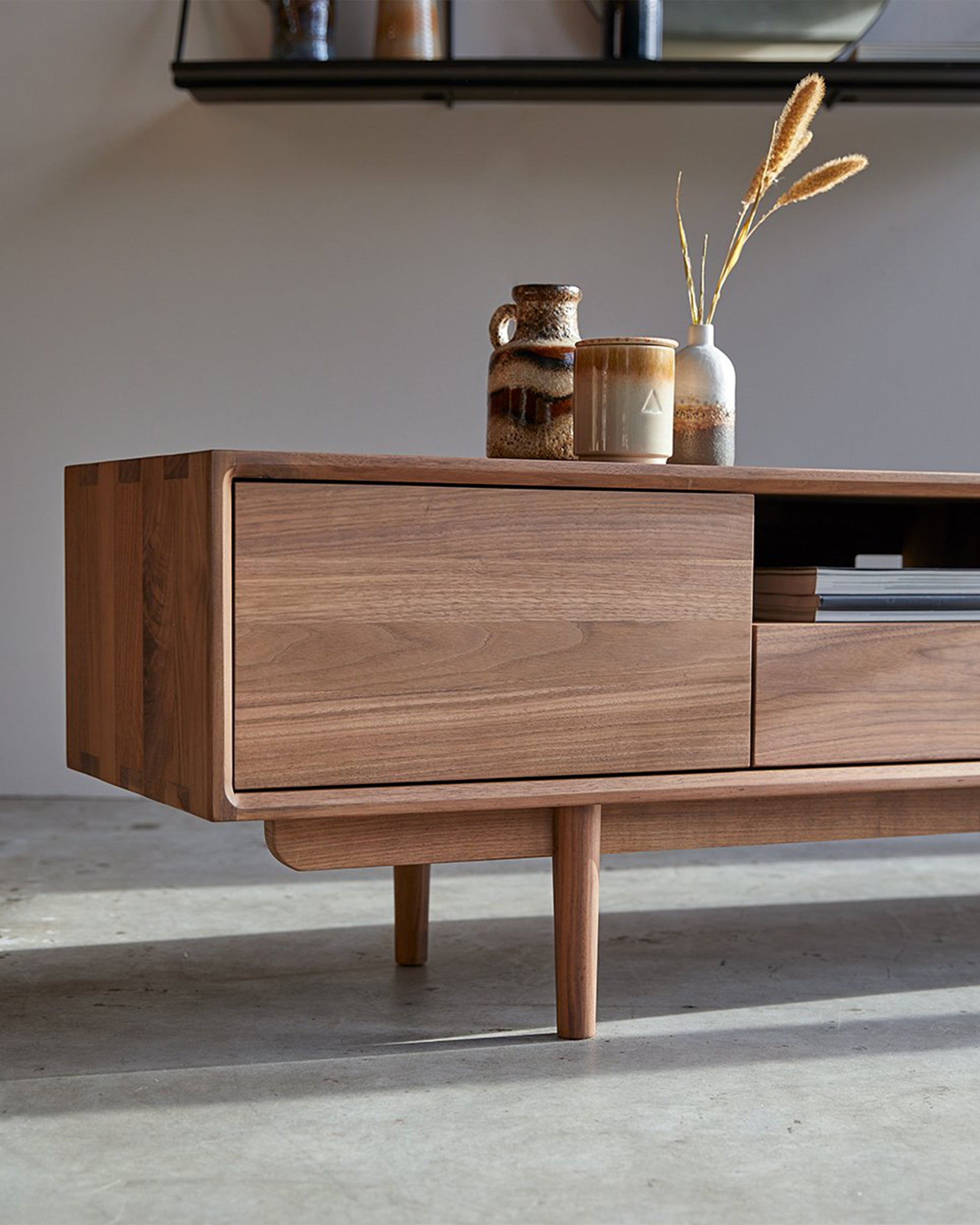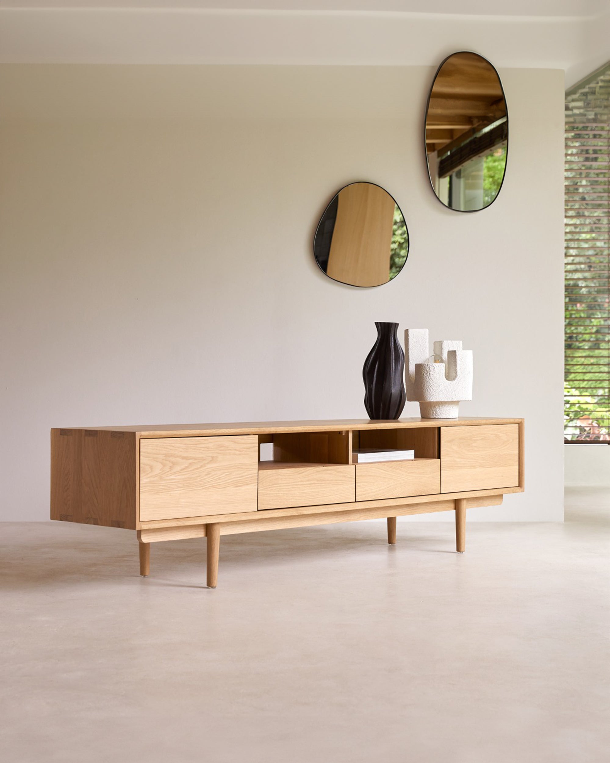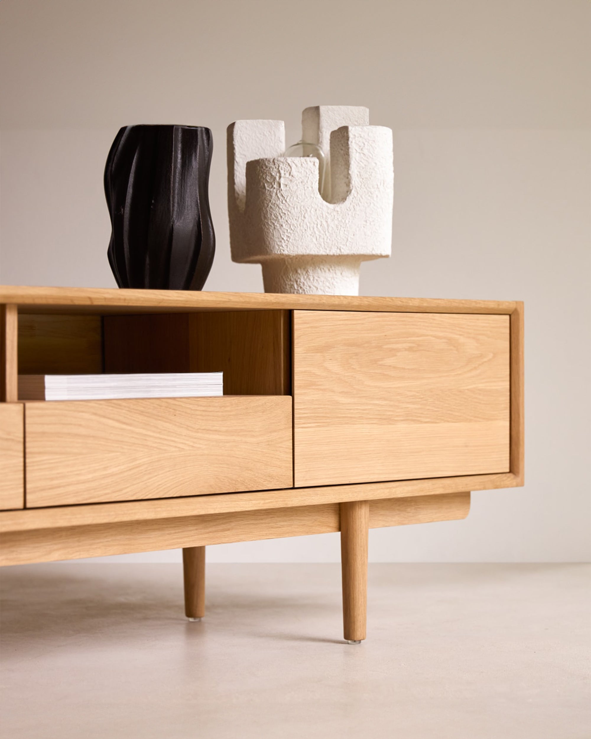 Perle TV Ünitesi, ilk bakışta sade ve zarif tasarımıyla dikkat çekerken, daha yakından incelendiğinde içe açılı çerçevesi, özenle tasarlanmış kenar dönüşleri, konik ayaklar ve kendinden kulp detayı gibi özellikleriyle göz kamaştıran bir tasarıma sahiptir. Bu ünite, hem estetik hem de işlevsellik açısından zengin bir deneyim sunar.