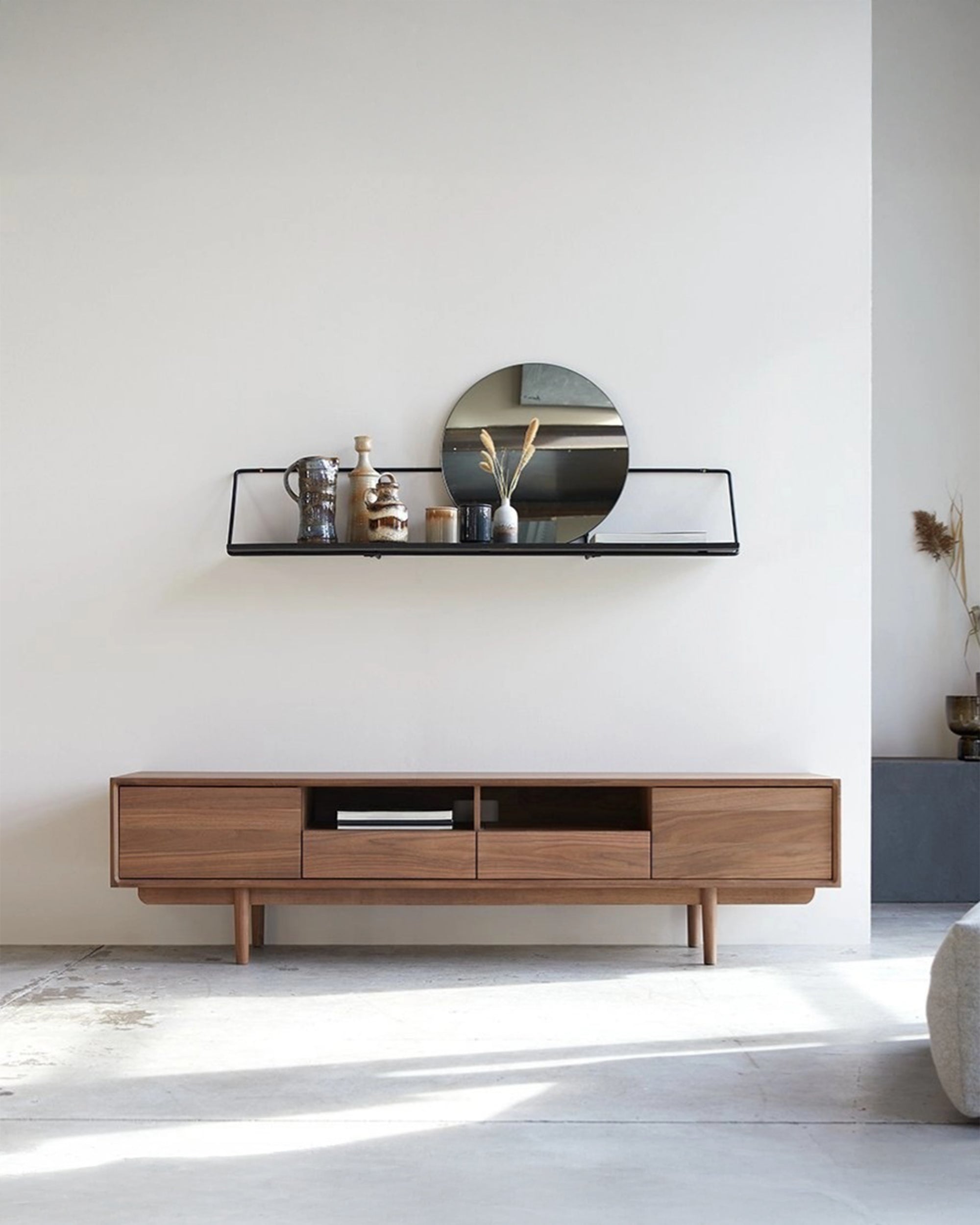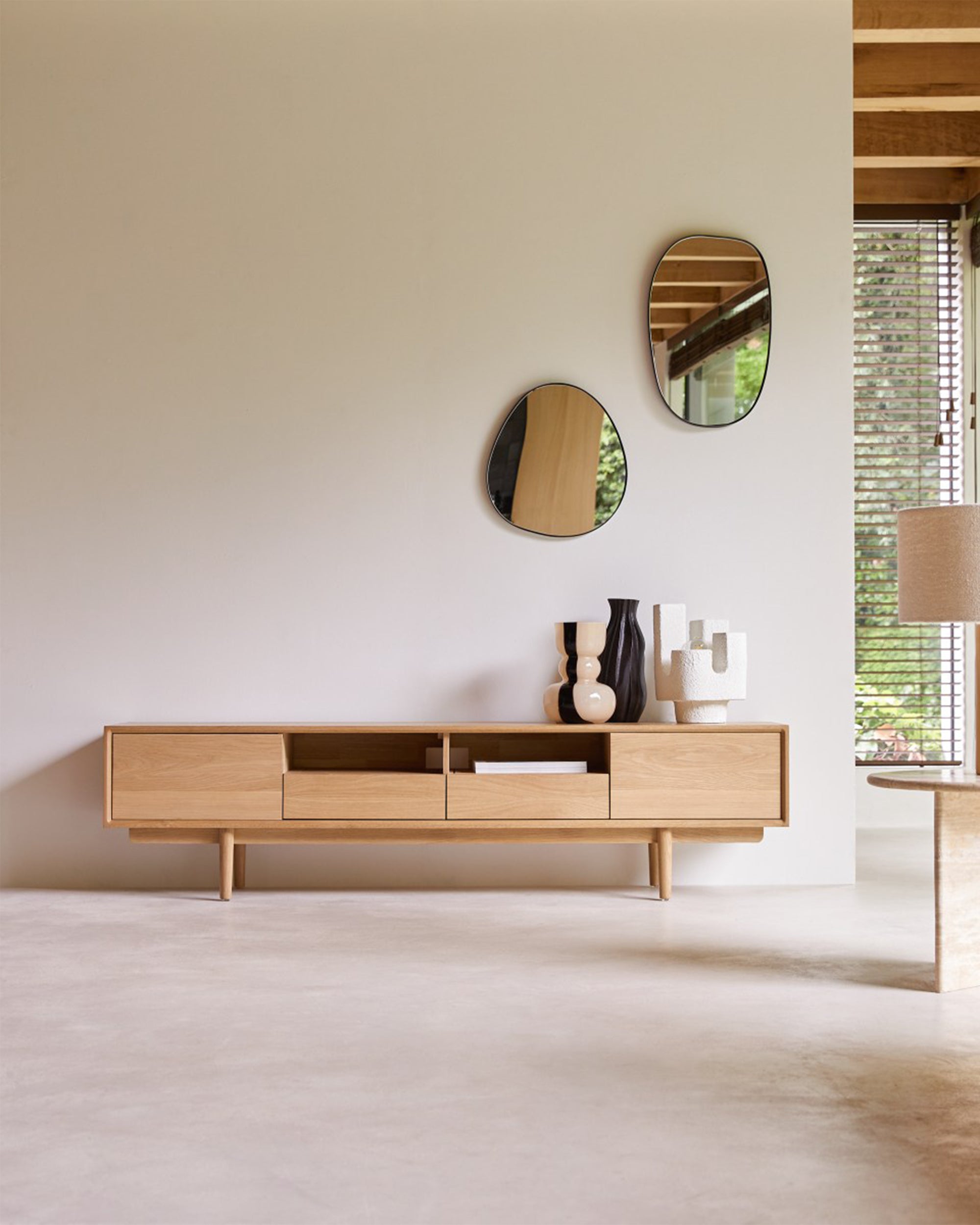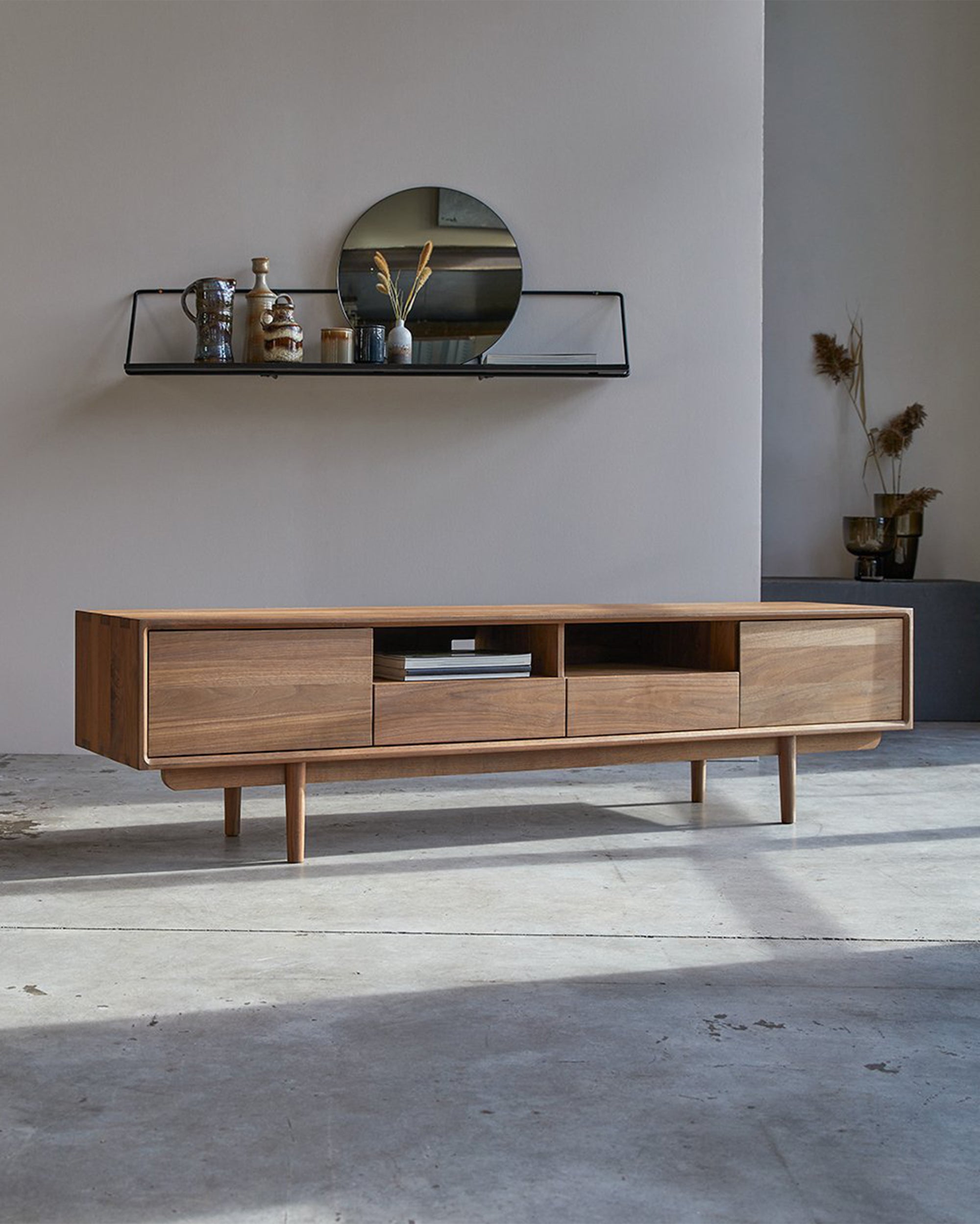 Perle TV Ünitesi, ilk bakışta sade ve zarif tasarımıyla dikkat çekerken, daha yakından incelendiğinde içe açılı çerçevesi, özenle tasarlanmış kenar dönüşleri, konik ayaklar ve kendinden kulp detayı gibi özellikleriyle göz kamaştıran bir tasarıma sahiptir. Bu ünite, hem estetik hem de işlevsellik açısından zengin bir deneyim sunar.