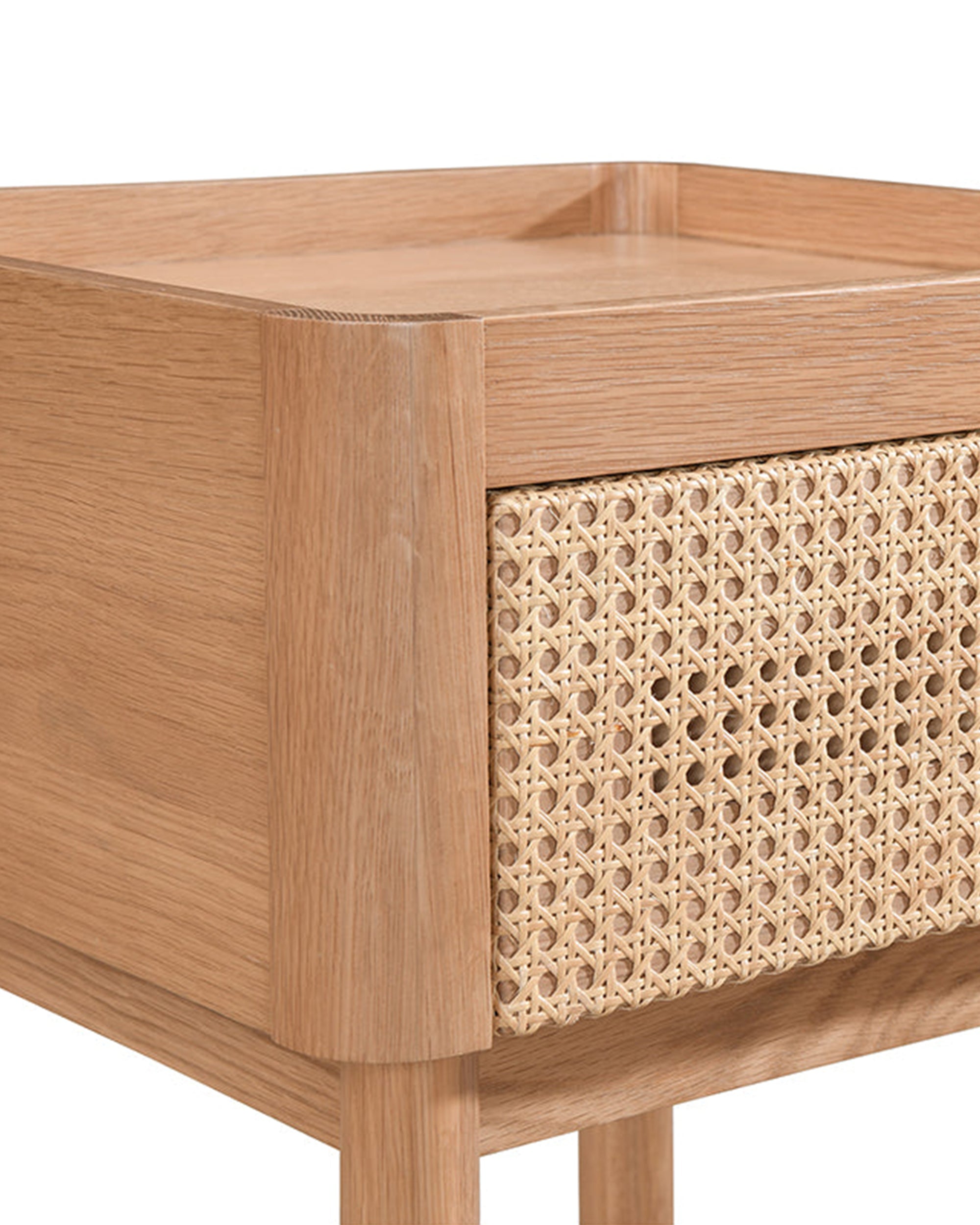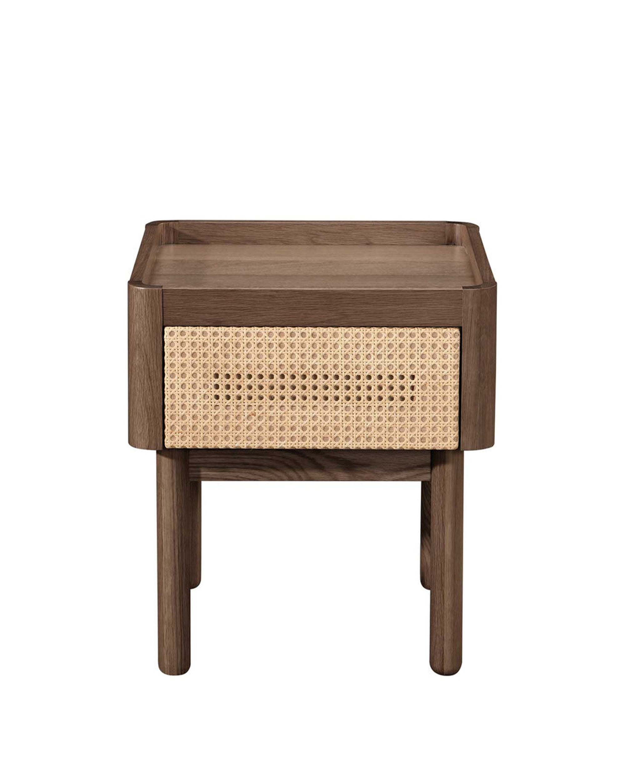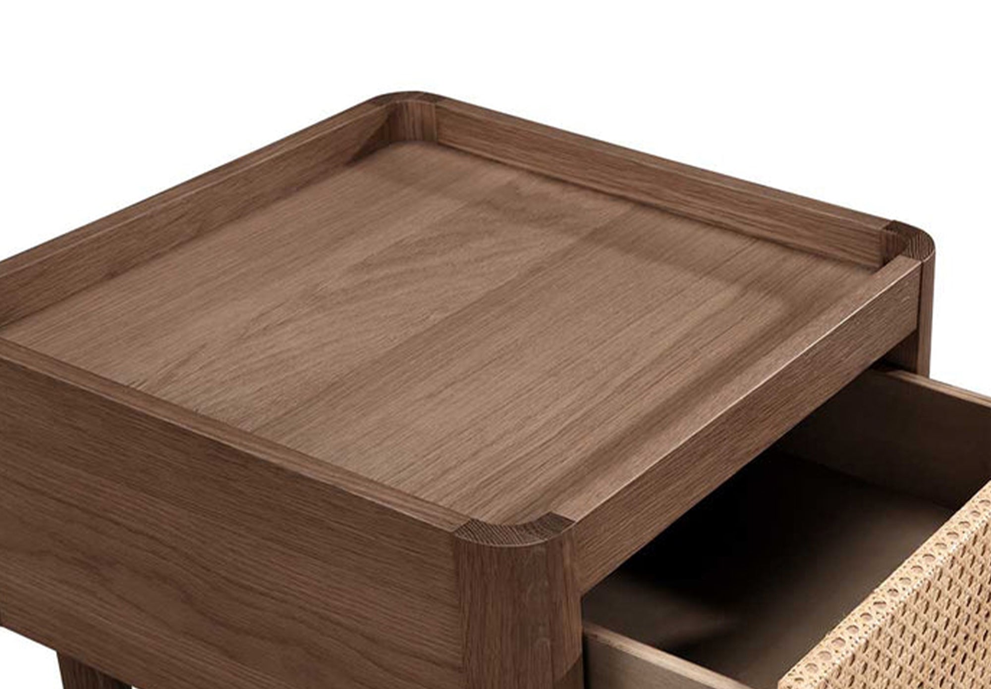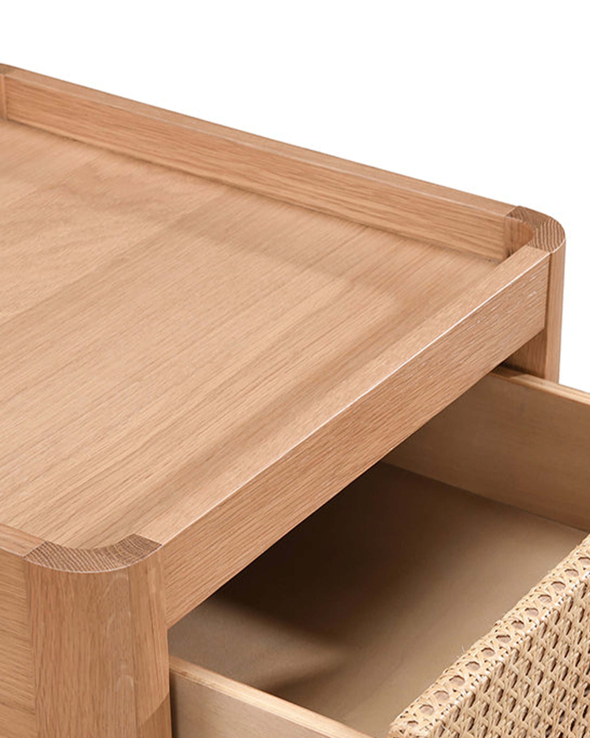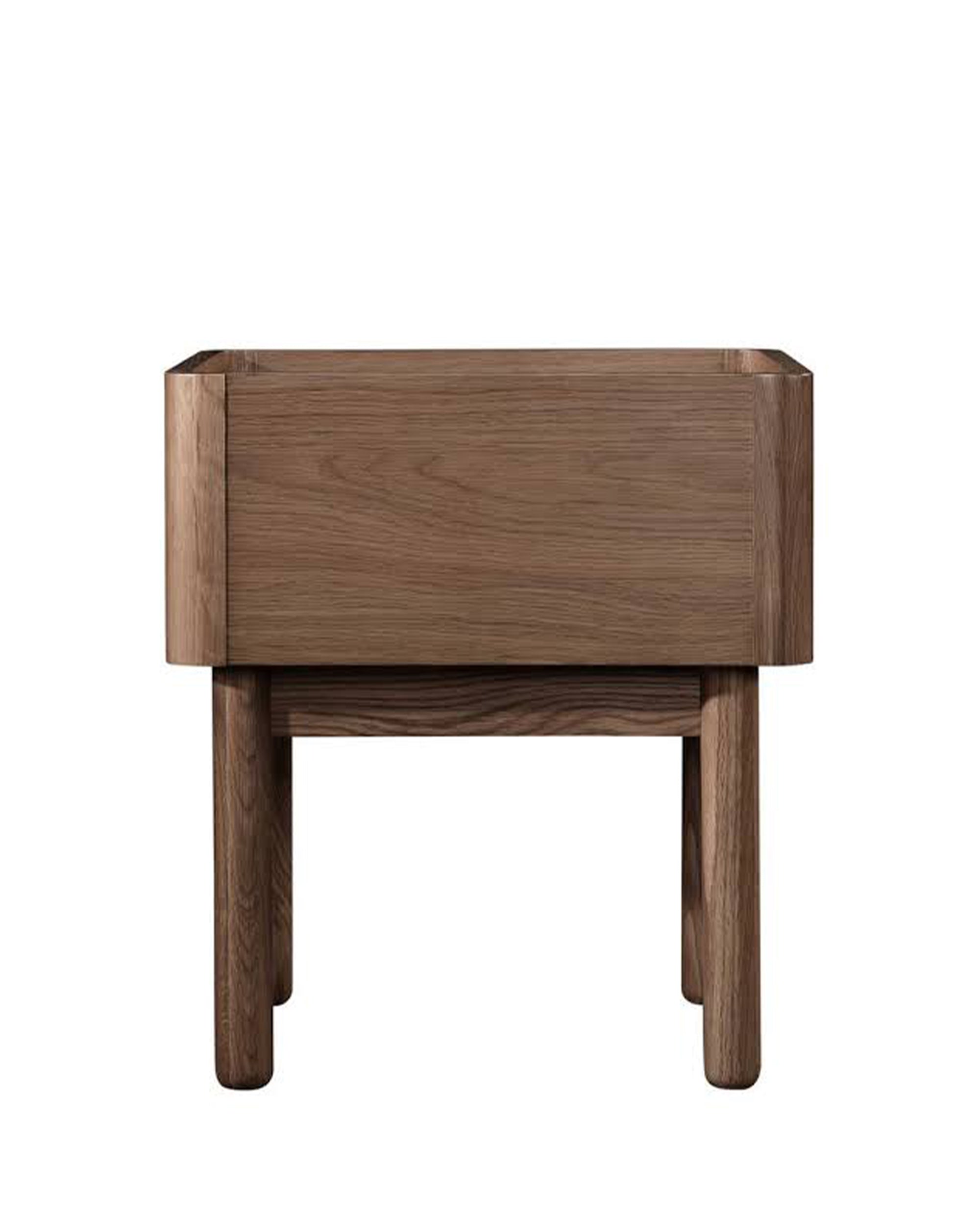 Yuvarlak ayak yapısını zarifçe yumuşatılmış kenar dönüşleri ile birleştiren Sekbe Komodin, üst tablasındaki derinlik detayı ile benzerlerinden ayrılırken, çekmece kapağındaki hazeran detayıyla özel bir dokunuş sunuyor. Gizli kendinden ise kullanım kolaylığı sağlamaya devam ediyor.