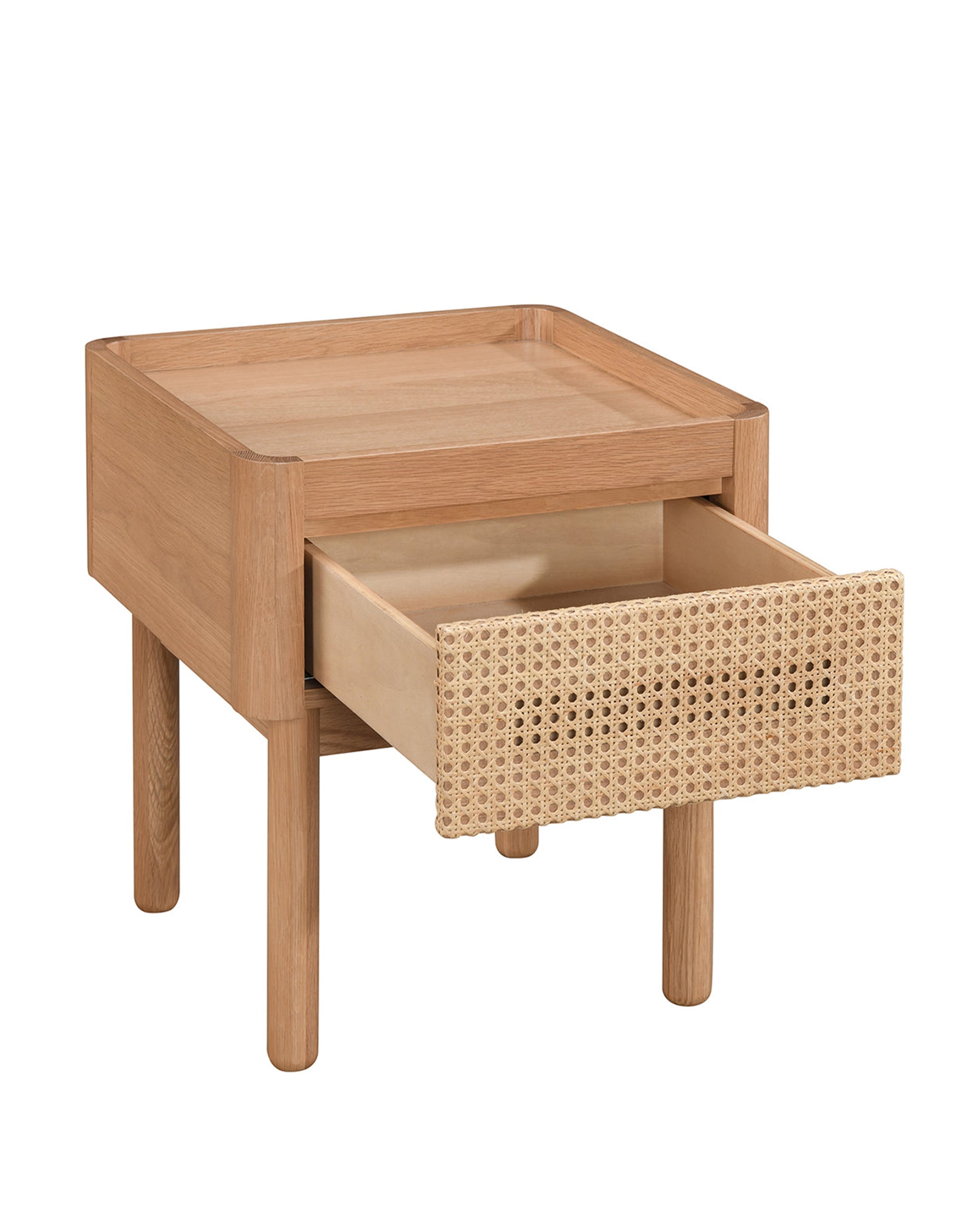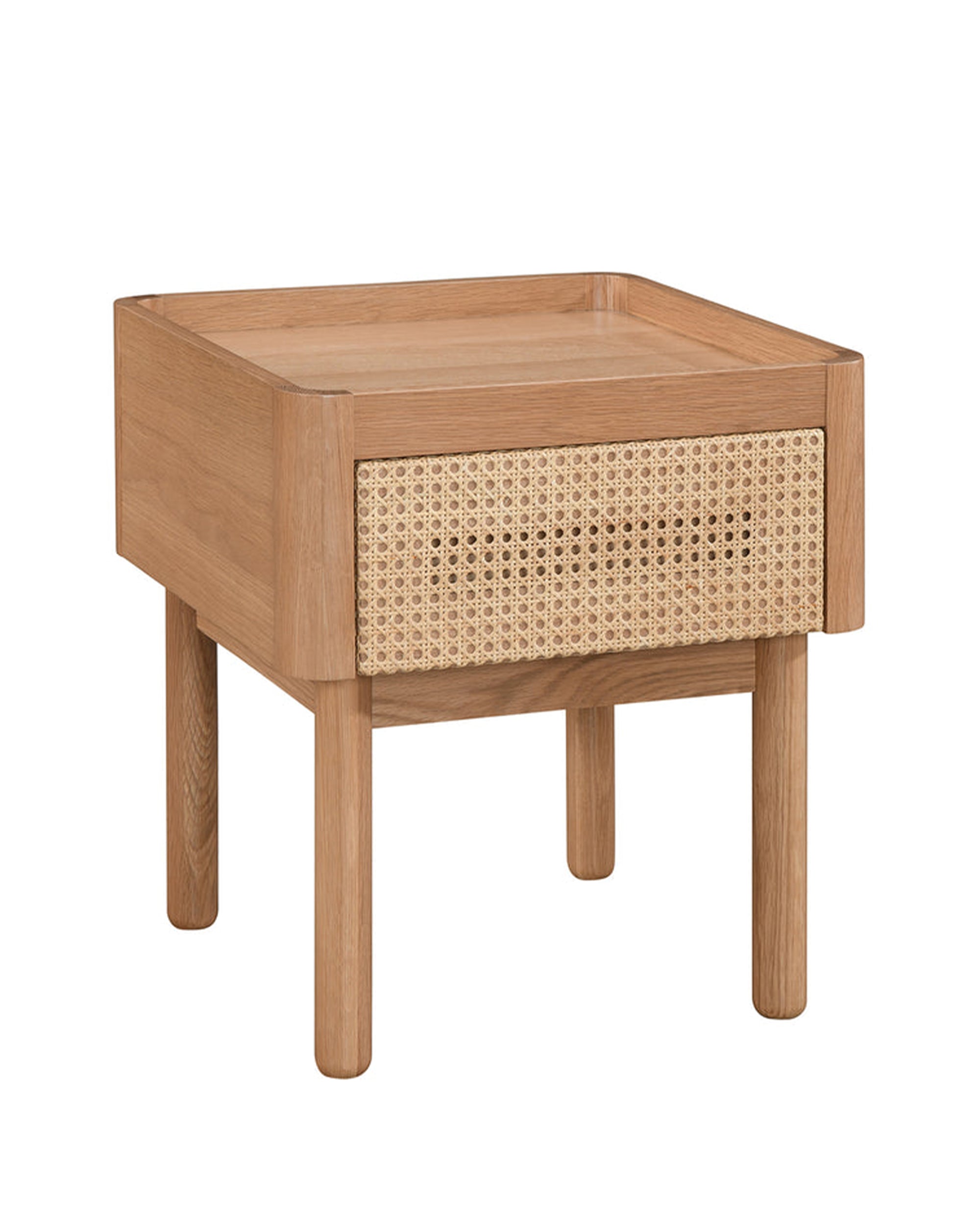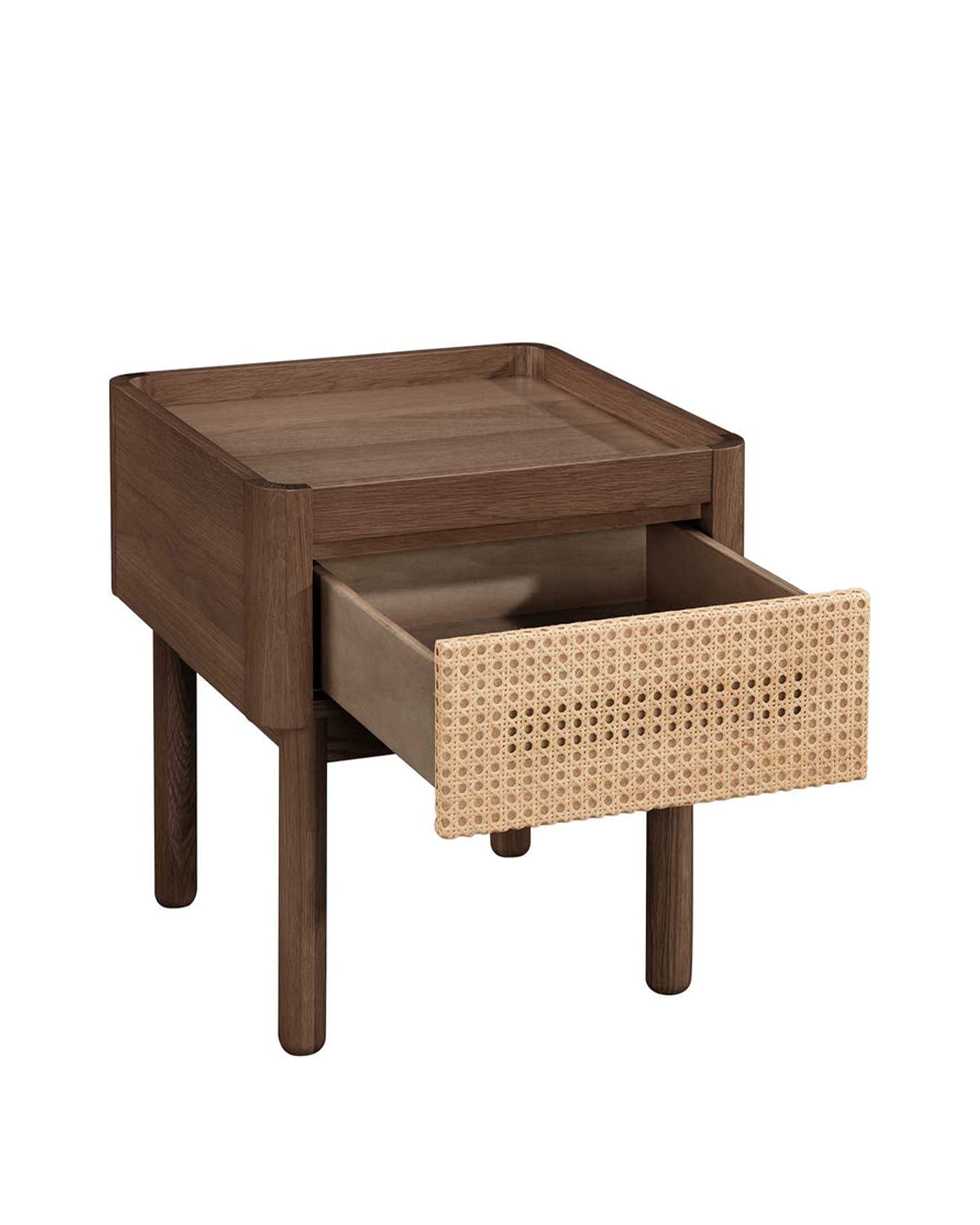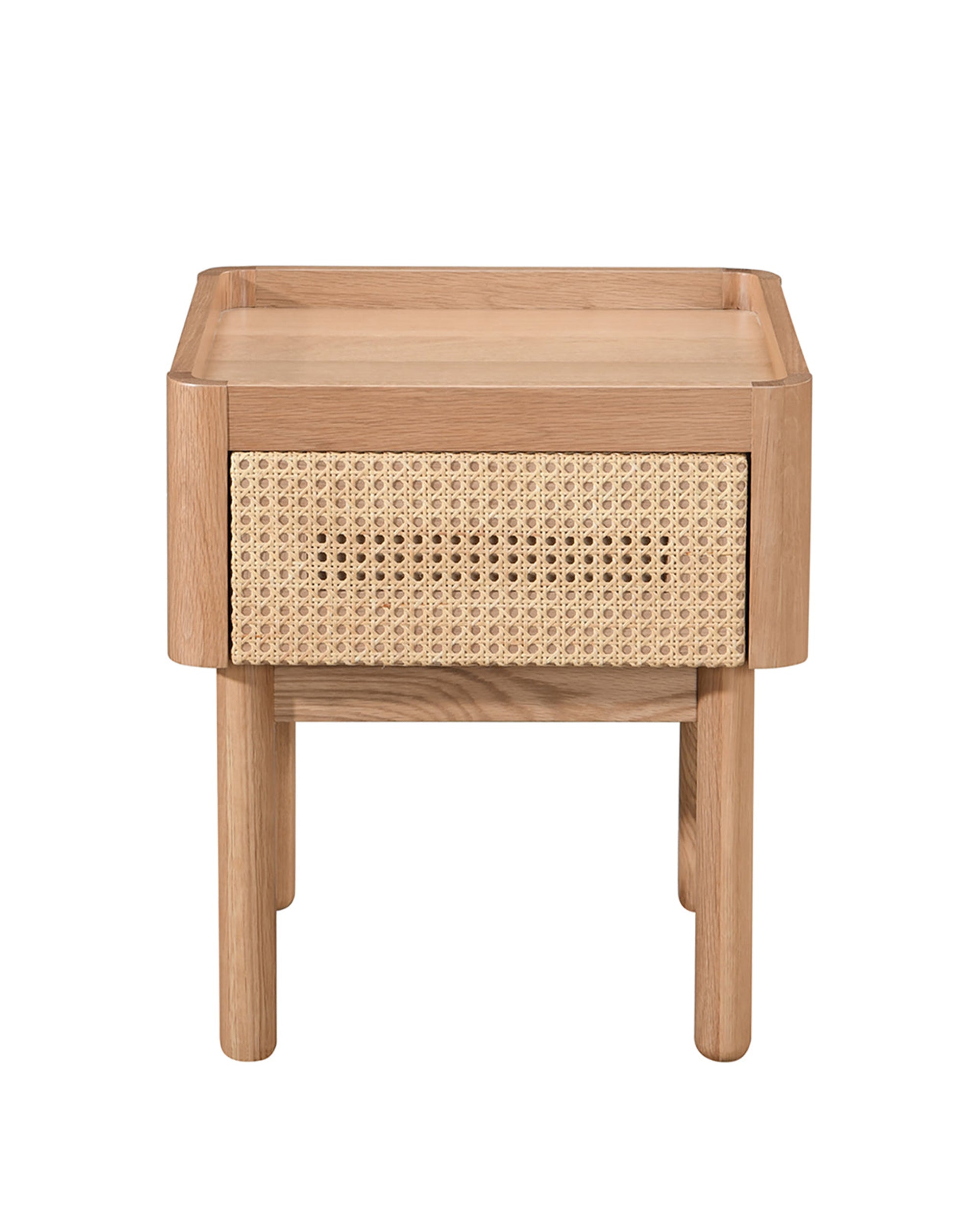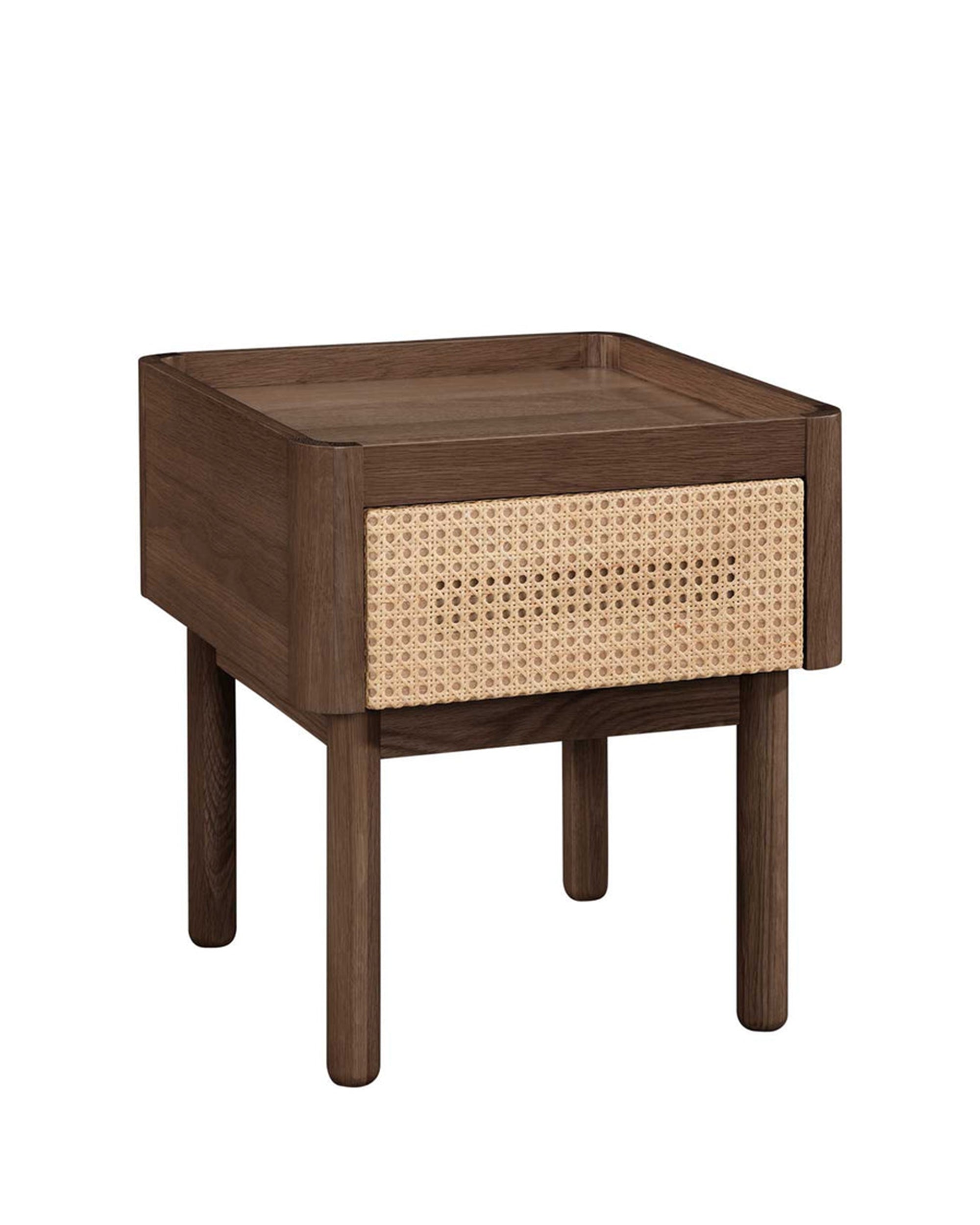 Yuvarlak ayak yapısını zarifçe yumuşatılmış kenar dönüşleri ile birleştiren Sekbe Komodin, üst tablasındaki derinlik detayı ile benzerlerinden ayrılırken, çekmece kapağındaki hazeran detayıyla özel bir dokunuş sunuyor. Gizli kendinden ise kullanım kolaylığı sağlamaya devam ediyor.